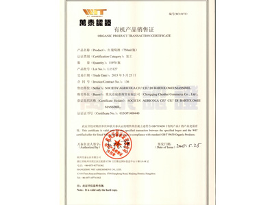在食品安全問(wèn)題頻繁發(fā)生導(dǎo)致食品安全問(wèn)題日益引起廣大消費(fèi)者的關(guān)注,有機(jī)葡萄酒的出現(xiàn),詮釋的不僅僅是優(yōu)雅和品味,更是健康!我們商品除了取得歐盟和意大利CCPB有機(jī)認(rèn)證,同時(shí)因2014年國(guó)家質(zhì)監(jiān)總局發(fā)行新規(guī)《有機(jī)產(chǎn)品認(rèn)證管理辦法》對(duì)進(jìn)口有機(jī)食品必須有中國(guó)有機(jī)認(rèn)證要求,自2015年進(jìn)口商品不但有歐盟和意大利有機(jī)認(rèn)證,同時(shí)具有中國(guó)認(rèn)證認(rèn)監(jiān)網(wǎng)可查詢的一瓶一碼有機(jī)認(rèn)證并取得有機(jī)銷售證書。至此,楚楚有機(jī)葡萄酒在取得歐盟有機(jī)認(rèn)證、意大利有機(jī)認(rèn)證之后,又取了中國(guó)的有機(jī)認(rèn)證,成為具有多重有機(jī)認(rèn)證的產(chǎn)品!